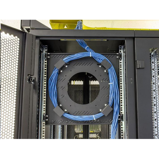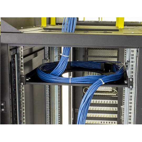 držiak je možné inštalovať vertikálne (10U) na 19" vertikálne lišty (zvyčajne na zadnej strane racku) alebo otočením držiakov horizontálne medzi vertikály ako klasickú policu. Podporné hroty namontované okolo centrálneho otvoru zabezpečujú polomer ohybu uložených káblov a zabraňujú ich poškodeniu.