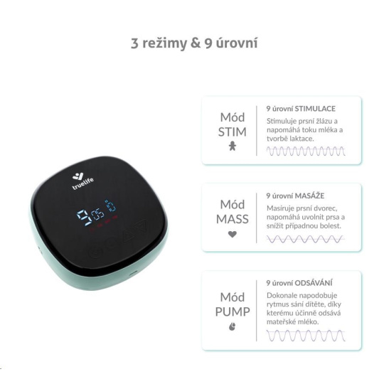 Kromě odsávání můžete zvolit ještě mód stimulace, nebo masáže. U každého módu máte na výběr z devíti úrovní, takže si odsávačku nastavíte přesně tak, jak vám vyhovuje.