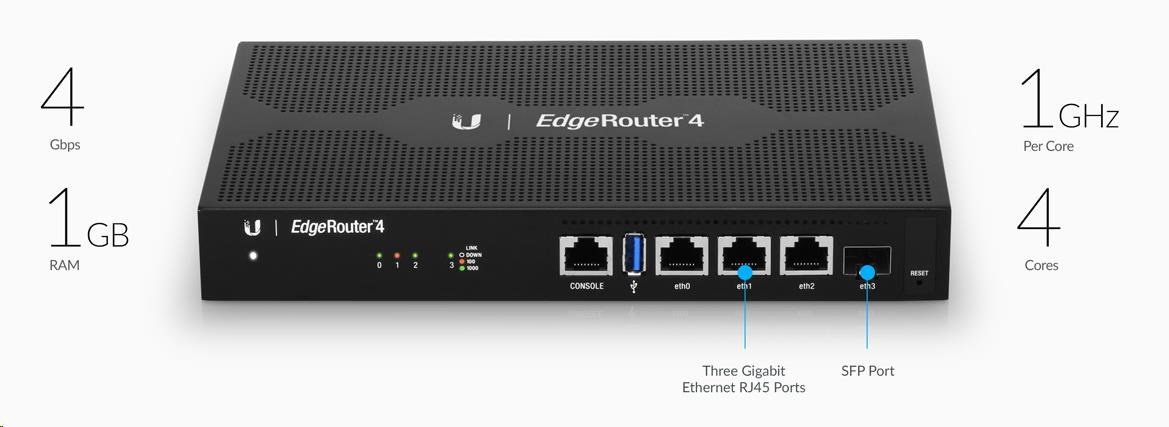 edgeRouter 4 je vhodný všade tam, kde je potrebné smerovať veľké množstvo dát, v malých a stredných podnikoch a všade tam, kde je prioritou bezpečnosť siete. EdgeRouter je vybavený celkovo 3x Gbit Ethernet porty, 1x SFP, dostatočne veľkou 1GB DDR3 pamäťou, 4GB úložným priestorom a 1x USB 3.0. Celú prevádzku riadi štvorjadrový procesor MIPS64 s taktom až 1 GHz a hardvérovou akceleráciou na spracovanie paketov. EdgeRouter ponúka všetky základné funkcie, ktoré od smerovača očakávate.