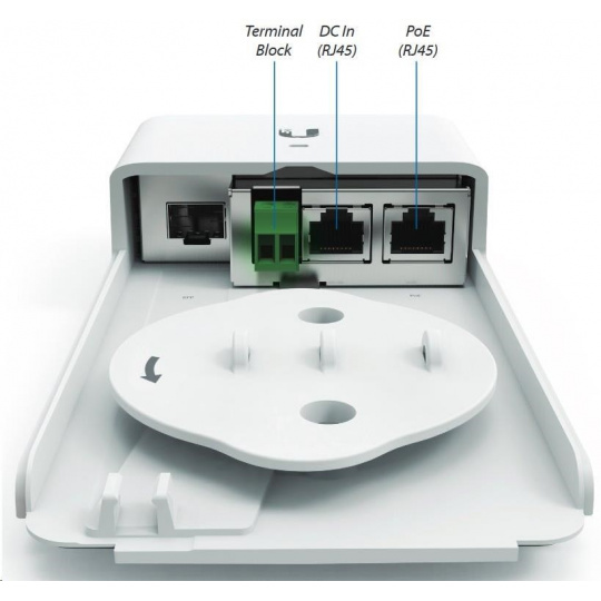fiberPOE obsahuje 2 ethernetové porty, 1 SFP slot a DC svorkovnicu. Na napájanie konvertora sú k dispozícii celkom 3 možnosti: prvá je DC svorkovnica, druhá a tretia sú cez porty RJ45. Prevodník preto môže byť napájaný z oboch ethernetových portov, ale dáta prenáša len port označený ako POE. Všetky 3 možnosti pracujú v rozsahu 16 až 50 V DC.