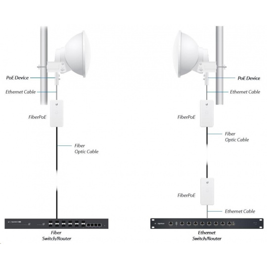 uBNT FiberPOE G2 je cenovo dostupný gigabitový vonkajší konvertor z optického vlákna na kov, ktorý okrem konverzie dát z optického vlákna na kovový kábel dokáže zabezpečiť aj napájanie prostredníctvom PoE. V porovnaní s prvou generáciou vydrží väčší rozsah teplôt (-40 až 60 °C).