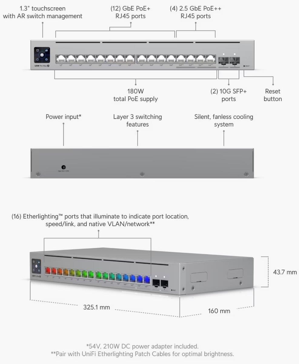 Popis produktu Ubiquiti Pro Max 16-PoE je novým L3 switchem, který nabízí 4x 2.5 Gbps porty s PoE++ až 60W a 12x 1 Gbps porty s PoE+. Celkový PoE budget je 180 W. Pro připojení pomocí optického rozhraní jsou připraveny 2 SFP+ porty dosahující rychlosti až 10 Gb/s. Switch je napájen DC adaptérem 54V DC 210W. Upozornění:pro montáž do racku je nutné dokoupit příslušenství Ubiquiti Pro Max 16 Rack Mount. Etherlighting technologie Switch podporuje technologii Etherlighting, která umožňuje barevně indikovat lokaci portu, linkovou rychlost, nadefinované typy zařízení, PoE status nebo barevně odlišit jednotlivé VLAN. Správa přes UniFi Controller Switch nemá webový management, ale je spravován centrálně pomocí UniFi Controlleru s podporou mobilní aplikace UniFi a nabízí rozsáhlou sadu pokročilých přepínacích protokolů a funkcí L2, včetně provozního režimu (přepínání, zrcadlení nebo agregace) na port. UniFi Network Controller a mobilní aplikace umožňují správcům konfigurovat a sledovat prakticky všechny funkce přepínače v grafickém uživatelském rozhraní odkudkoli. Obsah balení • Zařízení • Napájecí DC adaptér • Montážní set Technické parametry Konektory a rozhraní Rychlost LAN:(12) 10/100/1000Mbps + (4) 10/100/2500Mbps Optické rozhraní:(2) 1G/10Gbps Ostatní:Dotykový displej Napájení Typ napájení:DC konektor Typy PoE:PoE-Out (pouze) Podporované PoE-Out standardy:802.3af, 802.3at, 802.3at - ultra PoE (60W) Počet PoE Out portů:16 PoE budget [W]:180 Max. spotřeba energie [W]:210 Napájení přes konektor/svorkovnici:54V DC Fyzické charakteristiky Provedení:Na zeď, Desktop, Rackmount Ventilátory:Ne Šasi:Kovové Tlačítka:Reset Provozní teplota [°C]:-5 až 40 Šířka [mm]:325 Výška [mm]:44 Hloubka [mm]:160 Obecné Rychlost přepínání [Gbps]:84 Rychlost předávání paketů [Mpps]:62 Software Management:UniFi Network Funkce:VLAN, DHCP snooping, L3 Výchozí IP adresa:Dynamická z DHCP.
