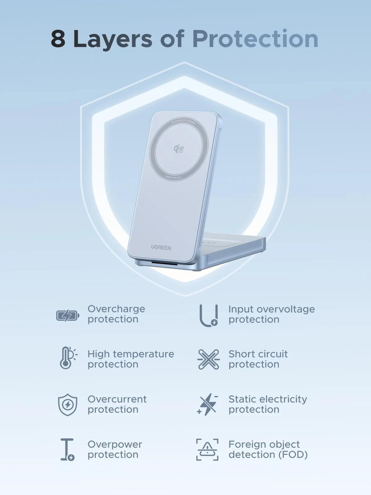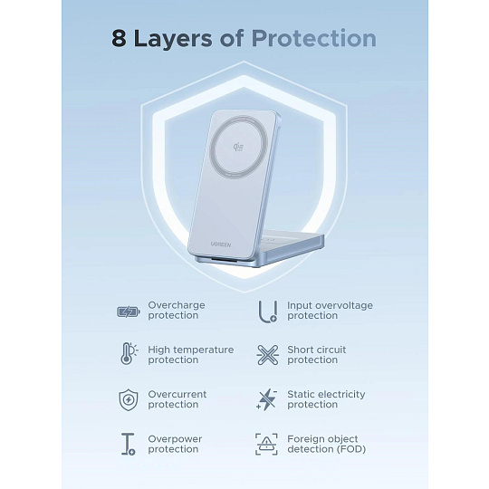 - Bezpečné a efektivní nabíjení: Ochrana proti přehřátí, nadproudu, přepětí, zkratu a detekce cizích objektů (FOD) chrání zařízení i baterii a prodlužuje její životnost