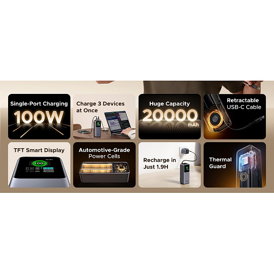 - Kompaktní s chytrým TFT displejem: Zobrazuje stav baterie, proud, napětí a výkon portů v reálném čase. Rozměry 146×45×50 mm / 550 g, sloupcový design
