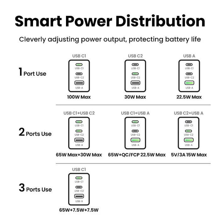 - 3portová USB-C nabíječka pro notebook: Umožňuje rychlé nabíjení až 3 zařízení současně díky inteligentnímu rozdělení výkonu (až 100 W).