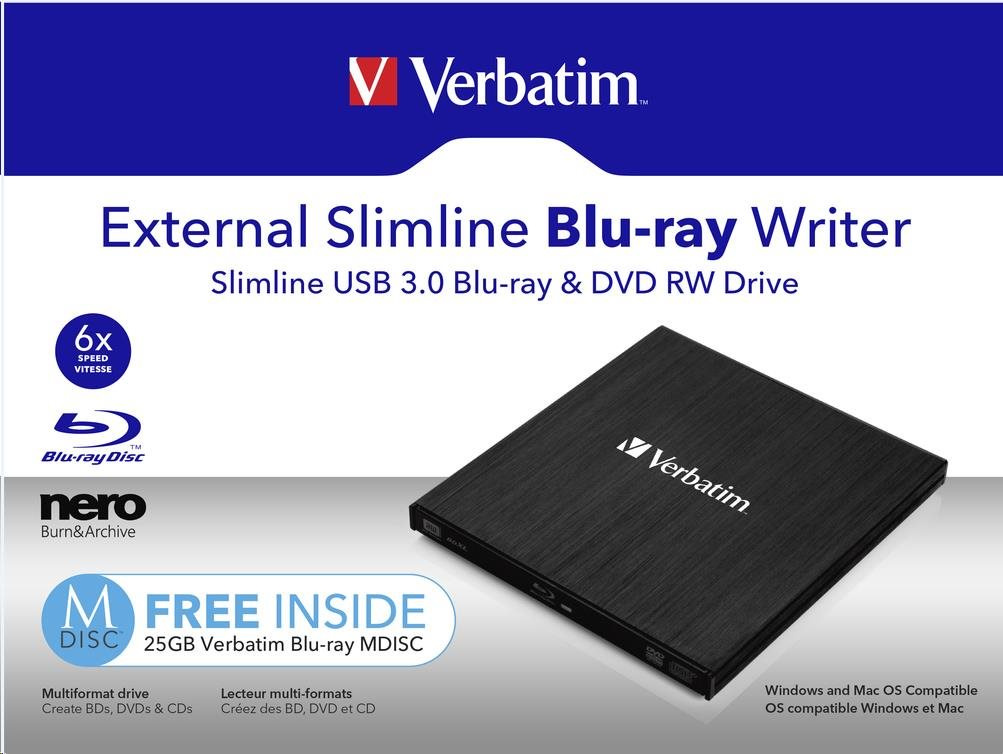 VERBATIM Slimline Blu-ray Rewriter USB 3.0 Bezplatný BR disk 25 GB (CD DVD BD Mdisc)