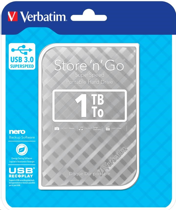 VERBATIM HDD 2.5" 1TB prenosný pevný disk Store 'n' Go USB 3.0, strieborná Špeciálne funkcie: Dostupné farby: čierna, strieborná, biela, červená a modrá Dostupné kapacity: 500 GB, 1 TB a 2 TB Vysokorýchlostné úložisko s vysokou kapacitou. Rýchle a bezpečné riešenie na rozšírenie úložiska alebo zálohovanie súborov USB 3.0 SuperSpeed - pre veľmi rýchly prenos dát Nero Backup Software Softvér na úsporu energie USB REC & PLAY* - podporuje nahrávanie/prehrávanie cez USB 2 roky obmedzená záruka** Systémové požiadavky: PC alebo Mac s USB 3.0 Windows XP / Vista / Windows 7 a 8 Mac OS X 10.4 alebo vyššia Obsah balenia: Prenosný pevný disk / USB 3.0 Kábel / Nero Backup Software / Green Button Energy Saving Software / Verbatim Formatter / Quick Start Guide / User Guide (predinštalovaný na disku)..
