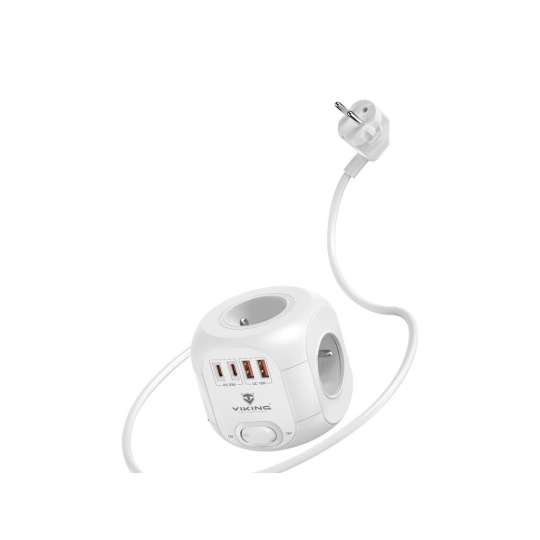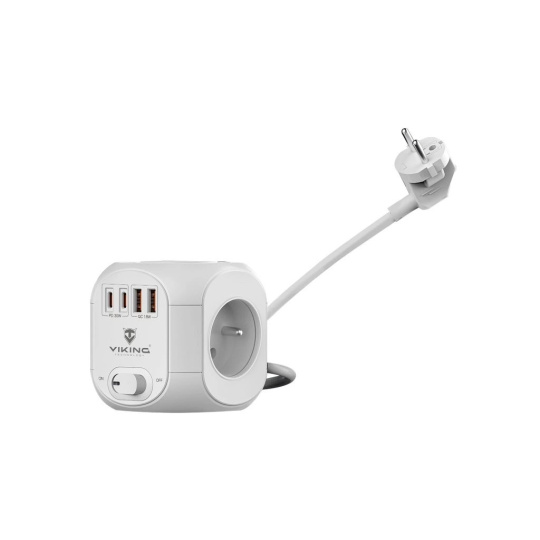Viking AC CUBE PD30 kombinuje štyri USB porty (2× USB-C, 2× USB-A), štyri sieťové zásuvky a 1,8m predlžovací kábel v jednom elegantnom a priestorovo úspornom zariadení. Umožňuje súčasne napájať až osem spotrebičov alebo elektroniky, pričom zbytočne nezaberá miesto na pracovnom stole.