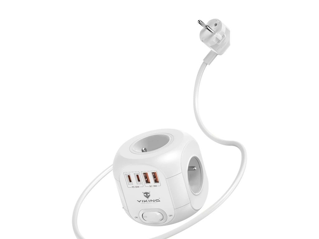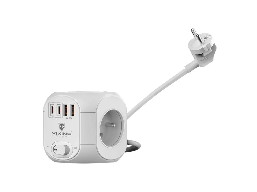 Viking AC CUBE PD30 kombinuje štyri USB porty (2× USB-C, 2× USB-A), štyri sieťové zásuvky a 1,8m predlžovací kábel v jednom elegantnom a priestorovo úspornom zariadení. Umožňuje súčasne napájať až osem spotrebičov alebo elektroniky, pričom zbytočne nezaberá miesto na pracovnom stole.