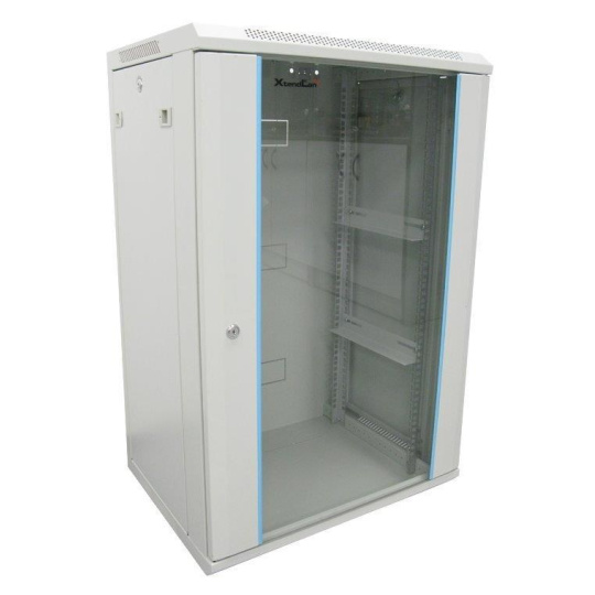 XtendLan 19" nástěnný rozvaděč 15U 600x600, nosnost 60 kg, skleněné kouřové dveře, rozložený, šedý