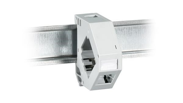 Plastový držiak na 1 lichobežníkový kameň na DIN lištu. Integrovaný kovový pásik zaisťuje uzemnenie lichobežníkového modulu.Štítok pre popis (odnímateľný po odstránení bočného krytu)..
